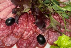 300/50 г • Колбаса с/к, карбонат свиной, ветчина говяжья к/в, томат черри, маслины, зелень