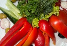 350 г • Свежие томат, огурец, болгарский перец, редис, томат черри, оливки, зелень