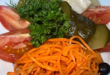 400 г • Огурцы соленые, томат соленый с чесноком, капуста провансаль, морковь по-корейски, зелень